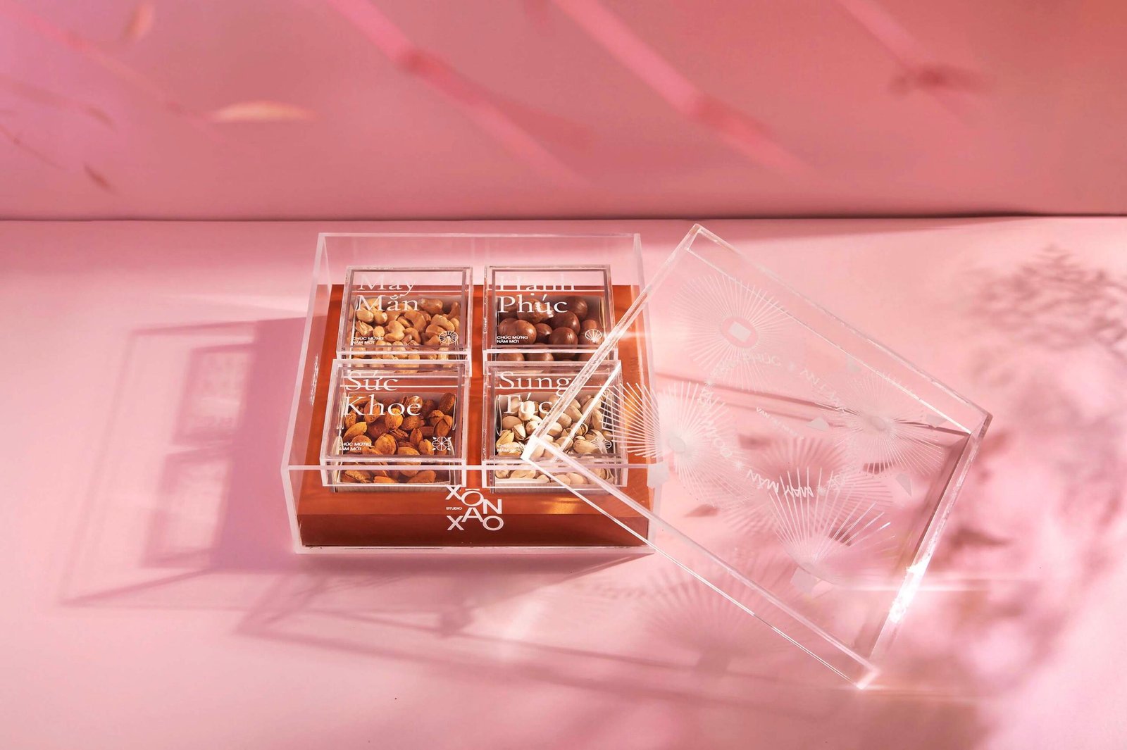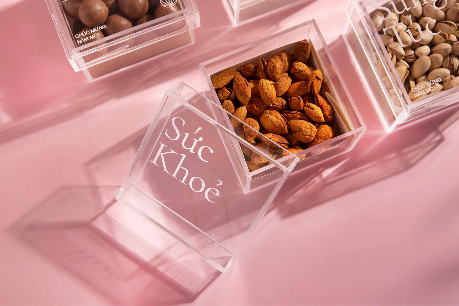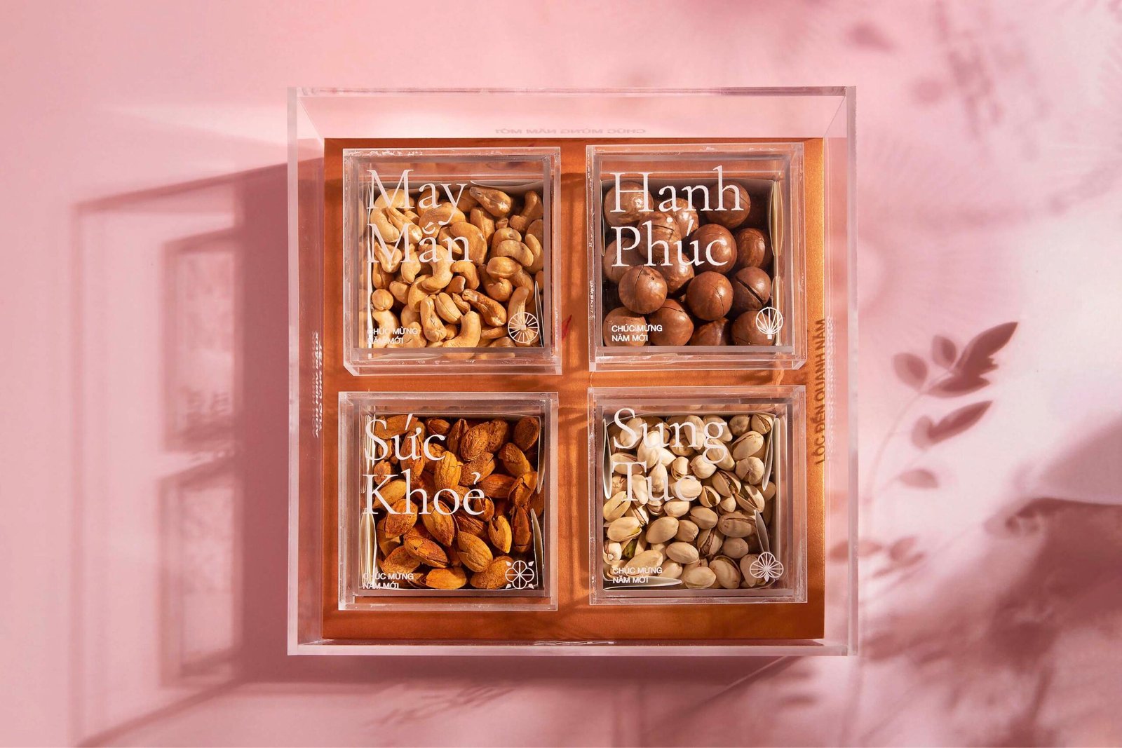 A gift box for every new year – Eternal Bloom was carried out in the last months of the year 2020 with the desire to honour the pure beauty of flowers and spread a cheerful spirit for a new year’s start. According to Vietnamese tradition, having a box of jam to serve to guests and flowers displayed around the house is indispensable in every Vietnamese family on spring days, and this is also the main idea for this Tet gift box. By using modern stylized pictures of blooming flowers and New Year’s greetings as the main motifs to design the gift box, we consider it a blessing of happiness and luck. In addition, this gift box also has a high value for health, inside the box are placed four types of nuts (cashew, maca, almonds and pistachios) that are completely natural and contain many nutrients. We collected them from the most reputable suppliers.