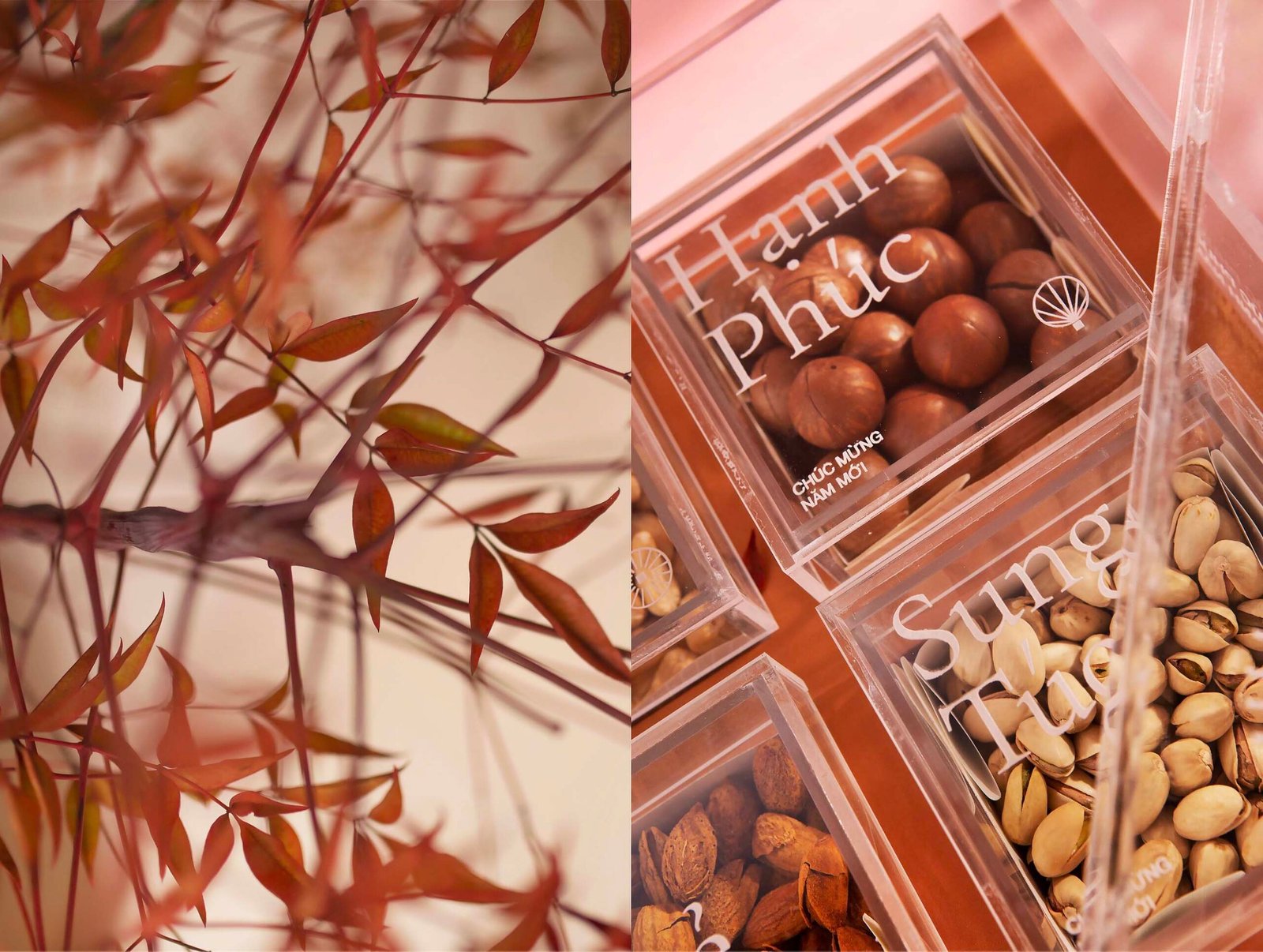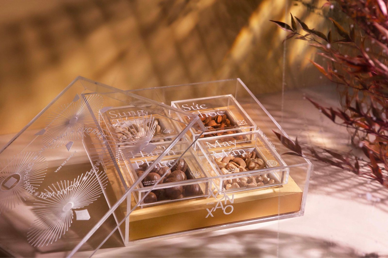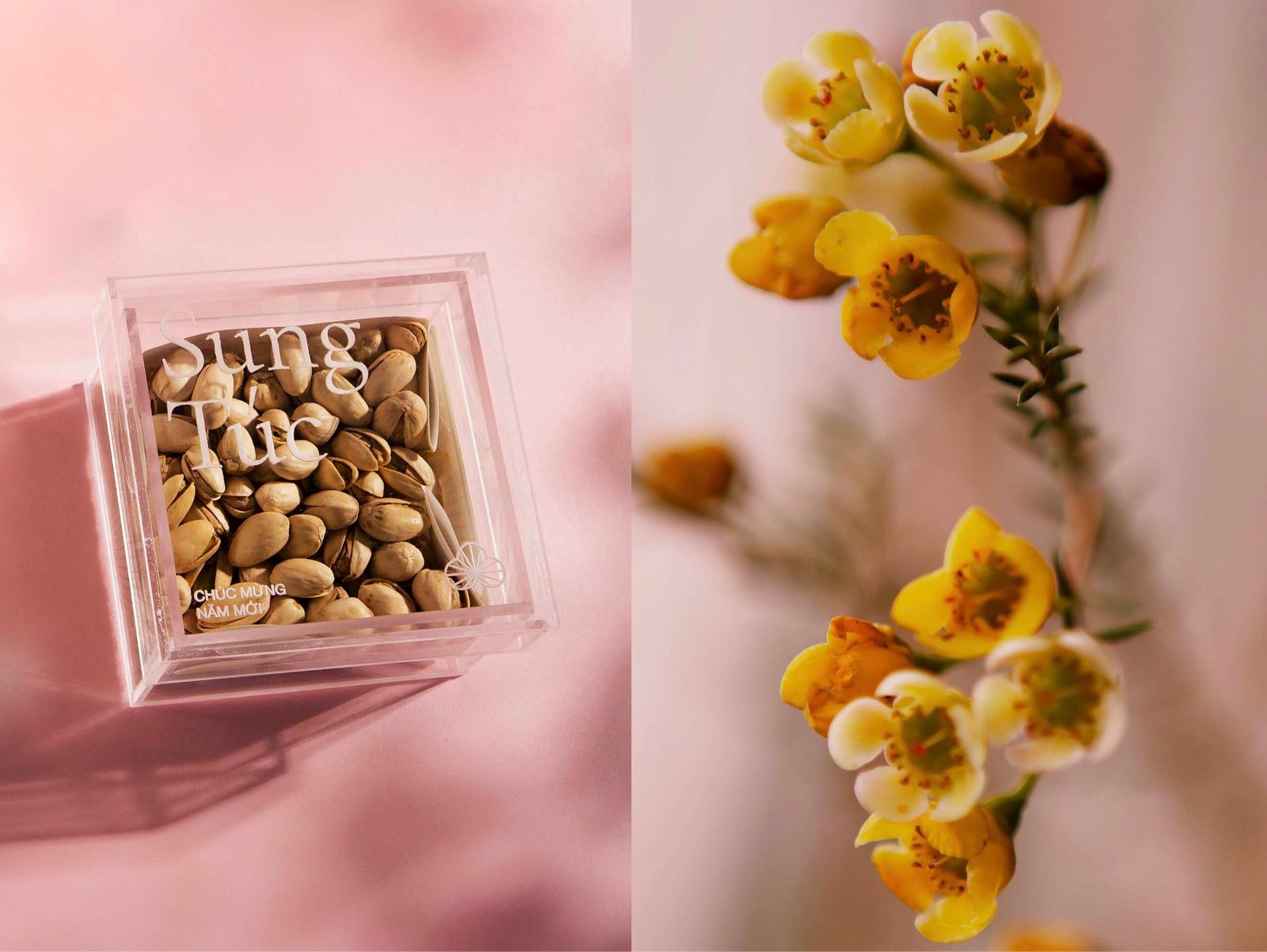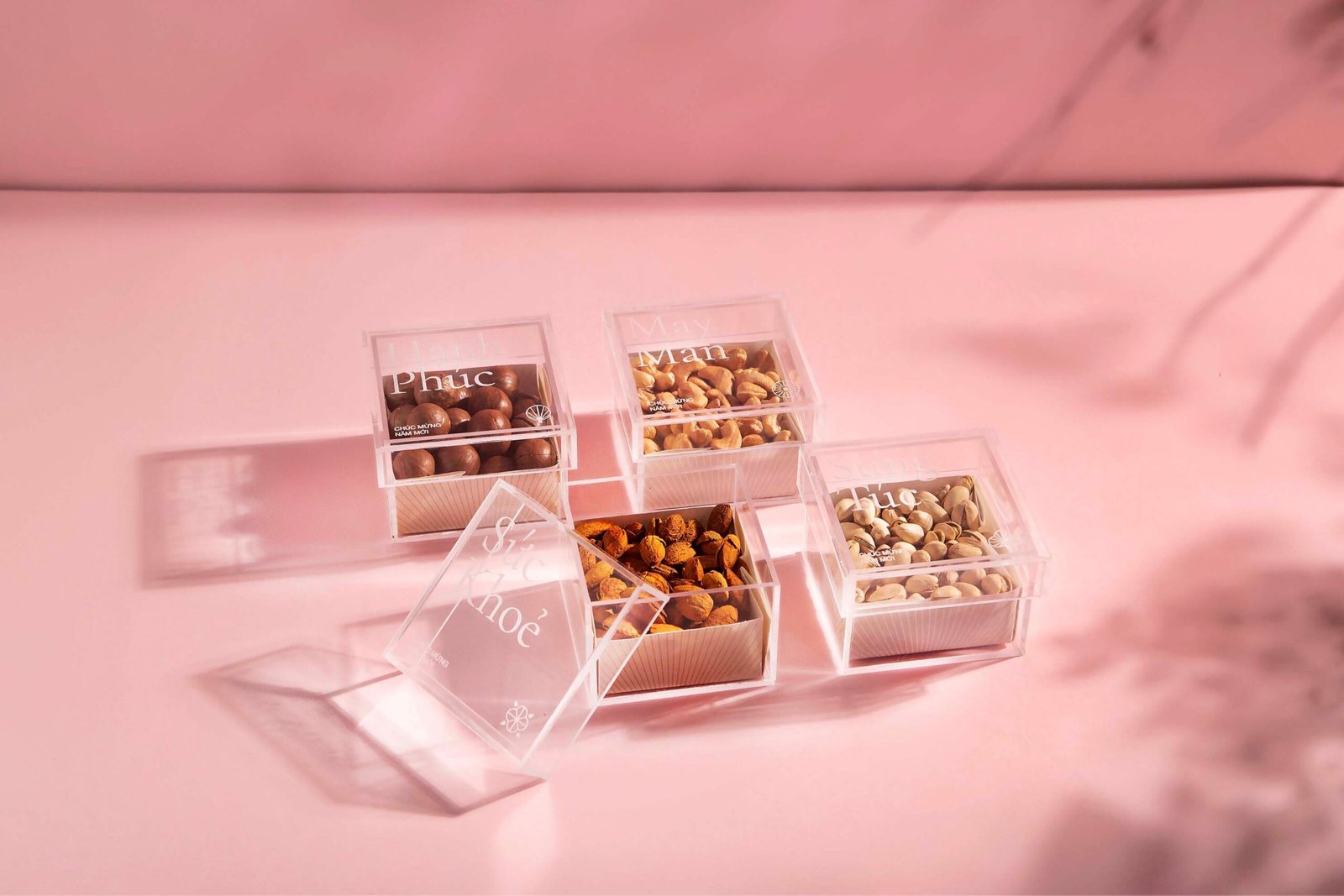 A gift box for every new year – Eternal Bloom was carried out in the last months of the year 2020 with the desire to honour the pure beauty of flowers and spread a cheerful spirit for a new year’s start. According to Vietnamese tradition, having a box of jam to serve to guests and flowers displayed around the house is indispensable in every Vietnamese family on spring days, and this is also the main idea for this Tet gift box. By using modern stylized pictures of blooming flowers and New Year’s greetings as the main motifs to design the gift box, we consider it a blessing of happiness and luck. In addition, this gift box also has a high value for health, inside the box are placed four types of nuts (cashew, maca, almonds and pistachios) that are completely natural and contain many nutrients. We collected them from the most reputable suppliers.