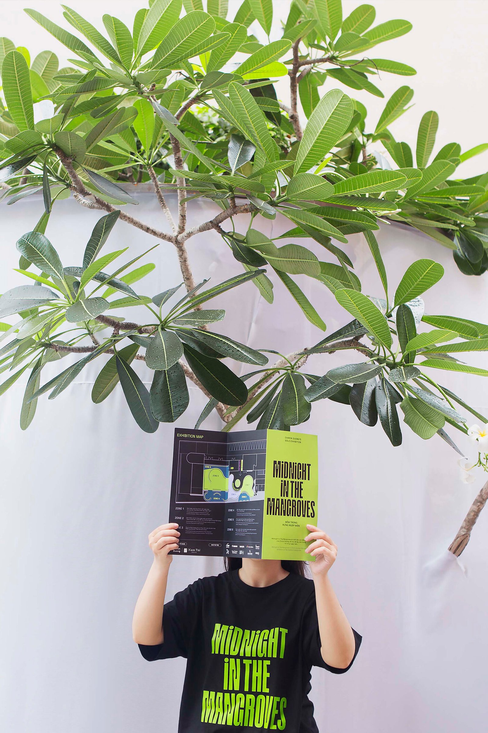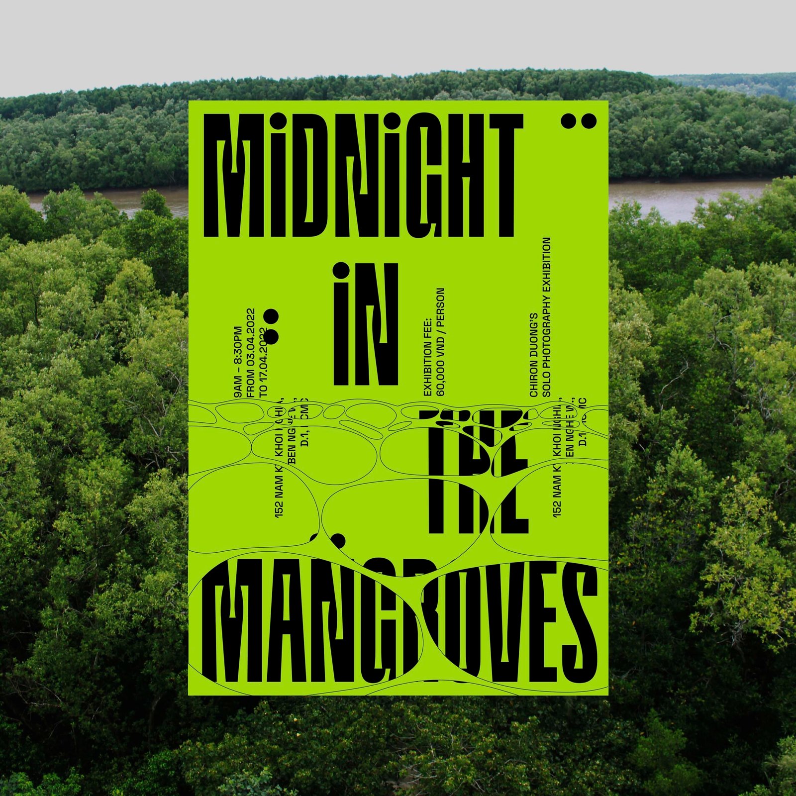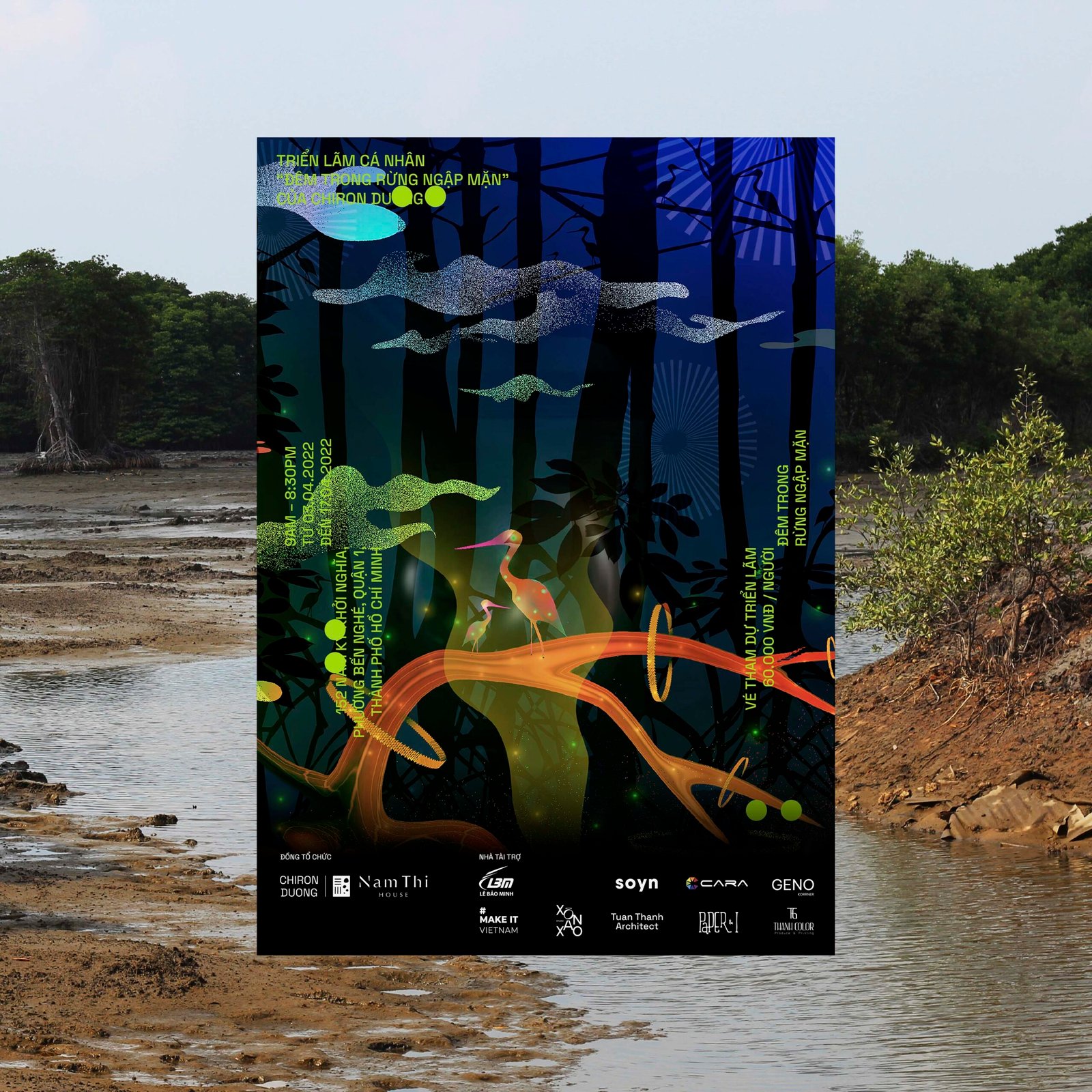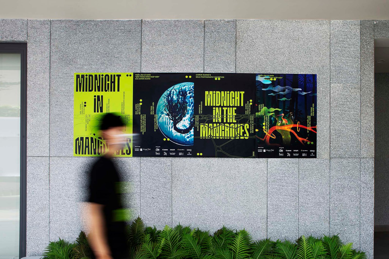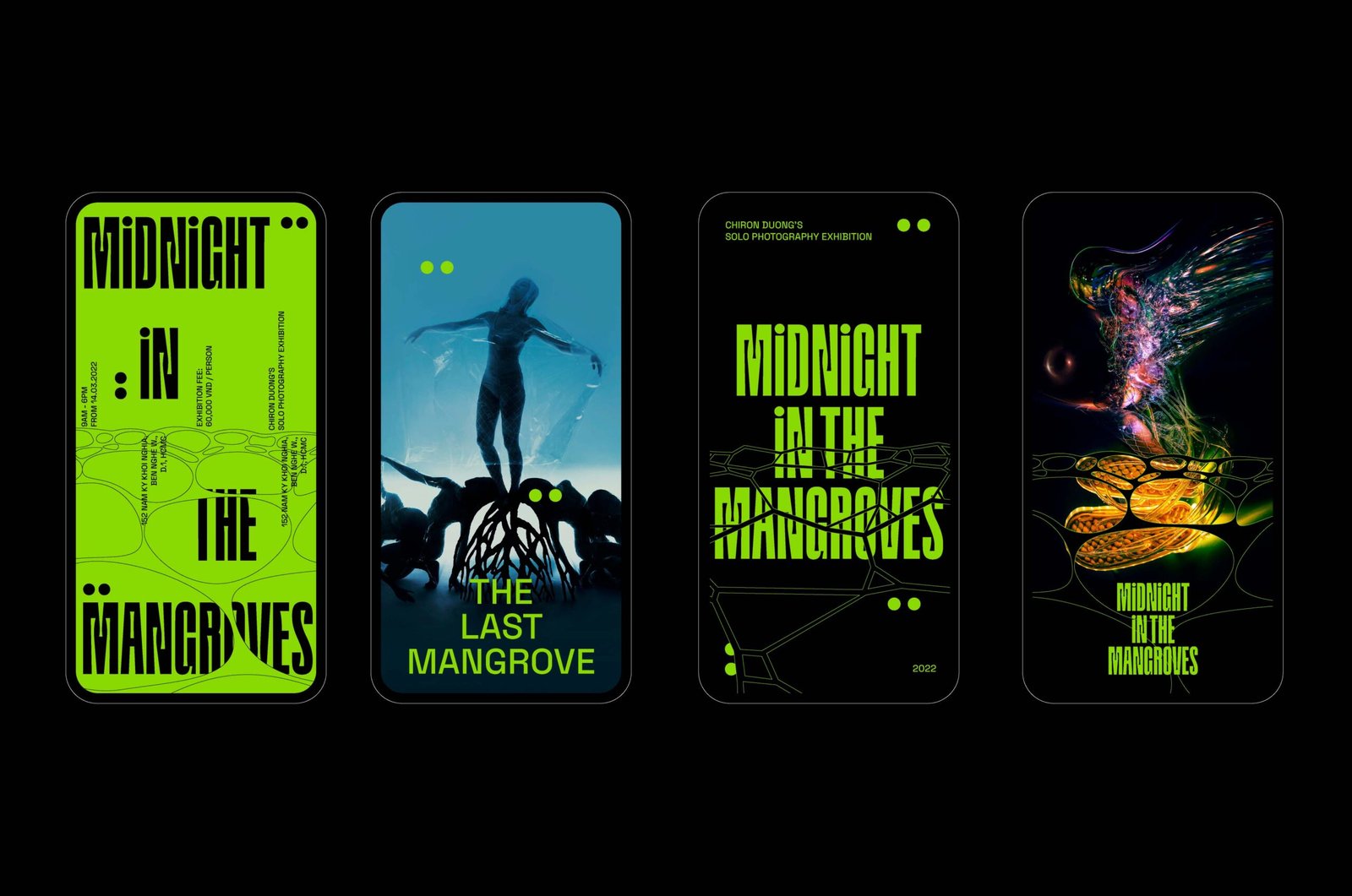 The visual system of the exhibition was developed based on the geography of the mangroves, including water and shallow areas interwoven with the roots of trees. With the theme, the mystery of the mangroves, we have associated the eyes of mysterious creatures behind the forest trees from the work of Chiron Duong. Combining the above ideas, a graphic system with mysterious colors of mangroves was formed. Based on mangrove studies & researches, we decided to design a typeface for this project. The main inspiration of the typeface is from the characteristic branches and roots of the mangrove forest and the close eyes of the specific creatures in the forest from underwater to terrestrial.